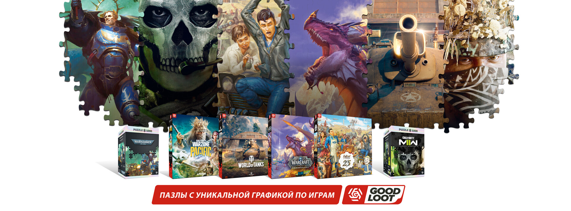 Good Loot - это пазлы из материалов высокого качества с интересными артами, выполненными в уникальной графике от разработчиков игр. В портфолио GOOD LOOT уже есть пазлы по таким популярным играм, как The Witcher, Cyberpunk 2077, Watch Dogs: Legion, Mafia III, Overwatch, Dying Light 2, Fallout, Assassin’s Creed, Diablo, Skyrim, World of Warcraft и многим другим. Благодаря пазлам от GOOD LOOT фанаты игр и пазлов смогут переместиться в свои любимые игровые миры, собирая их буквально по кусочкам! Серия пазлов будет постоянно расширяться, как новыми графическими темами, так и новыми лицензиями.
